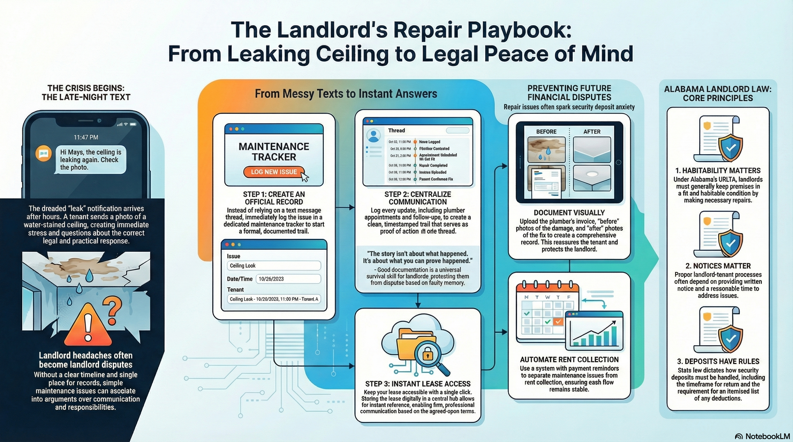 It was the fear underneath it. The kind that whispers: What does Alabama landlord law say Iâm supposed to do right now? (Also: why do leaks always wait for after-hours?)