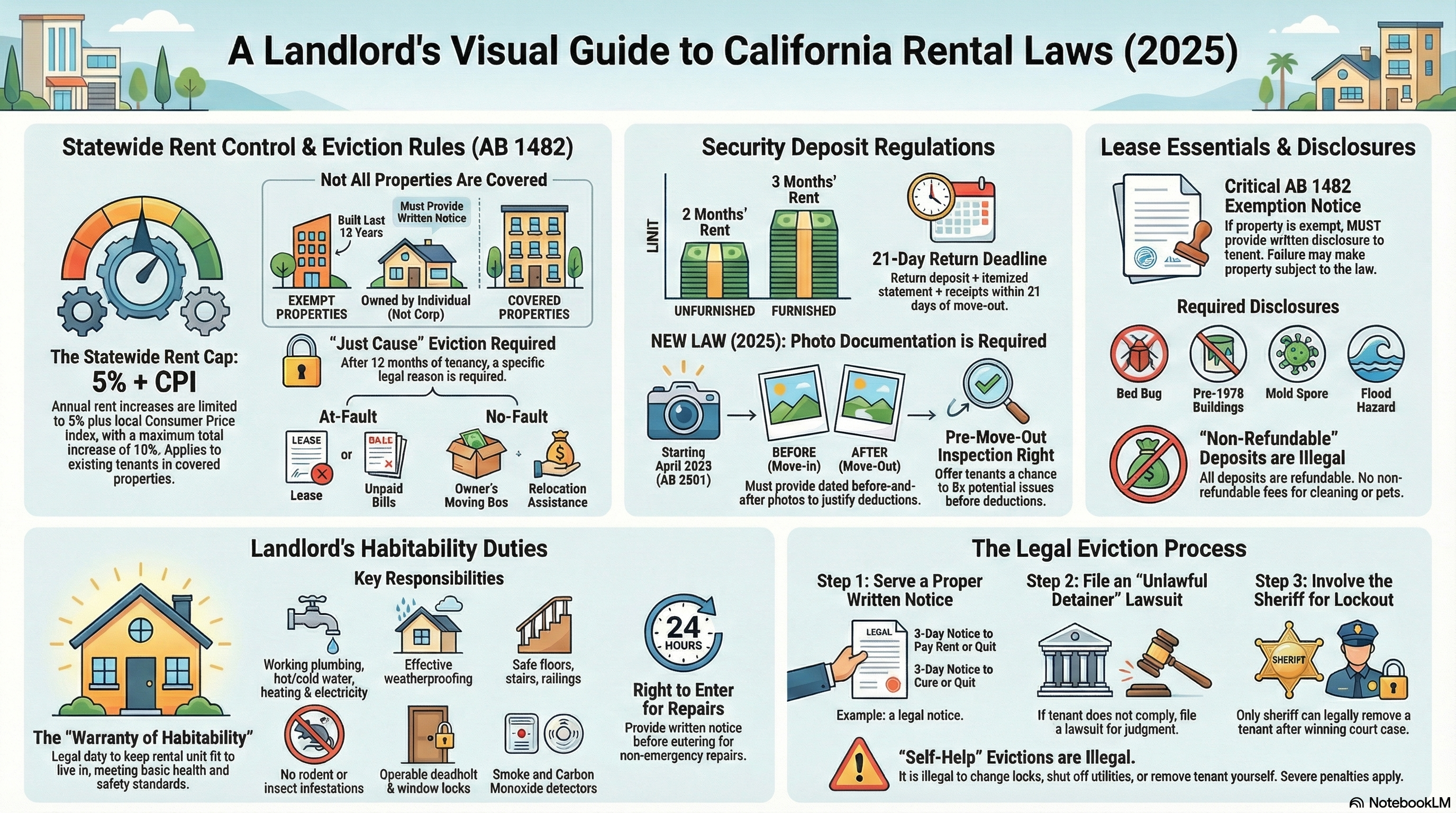 Civil Code & Tenant Protection Act (AB 1482): The California Civil Code (particularly Sections 1940-1954) lays out many landlord-tenant rules: habitability (warranty of habitability from case law like Green v. Superior Court), security deposit limits, privacy rights (Civil Code §1954), etc. In 2019, the state passed AB 1482, effective 2020, which introduced statewide rent caps and just-cause eviction requirements for many (not all) residential rentals. This was a game-changer: It limits annual rent increases to 5% + local CPI (inflation), not to exceed 10% total. It also means after 12 months of tenancy, you need a “just cause” to evict the tenant. We’ll dive more into these in the rent and eviction sections.